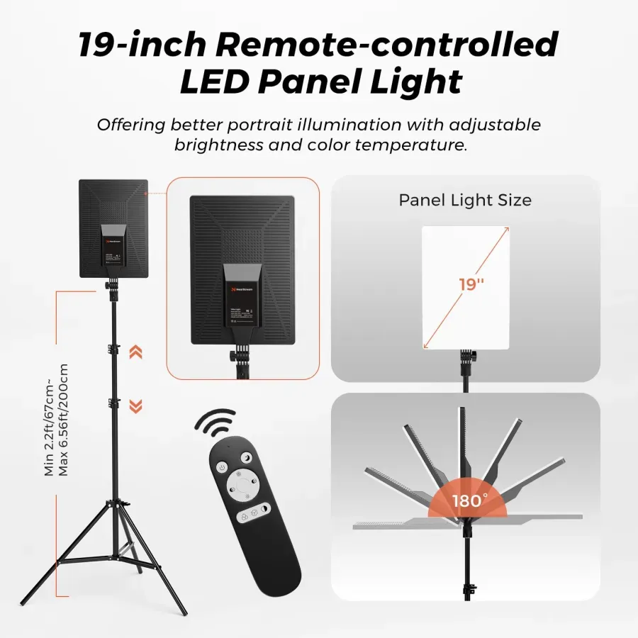 Wide-angle lighting with 180° tilt, remote-controlled brightness & color — ideal for portraits and studio setups.